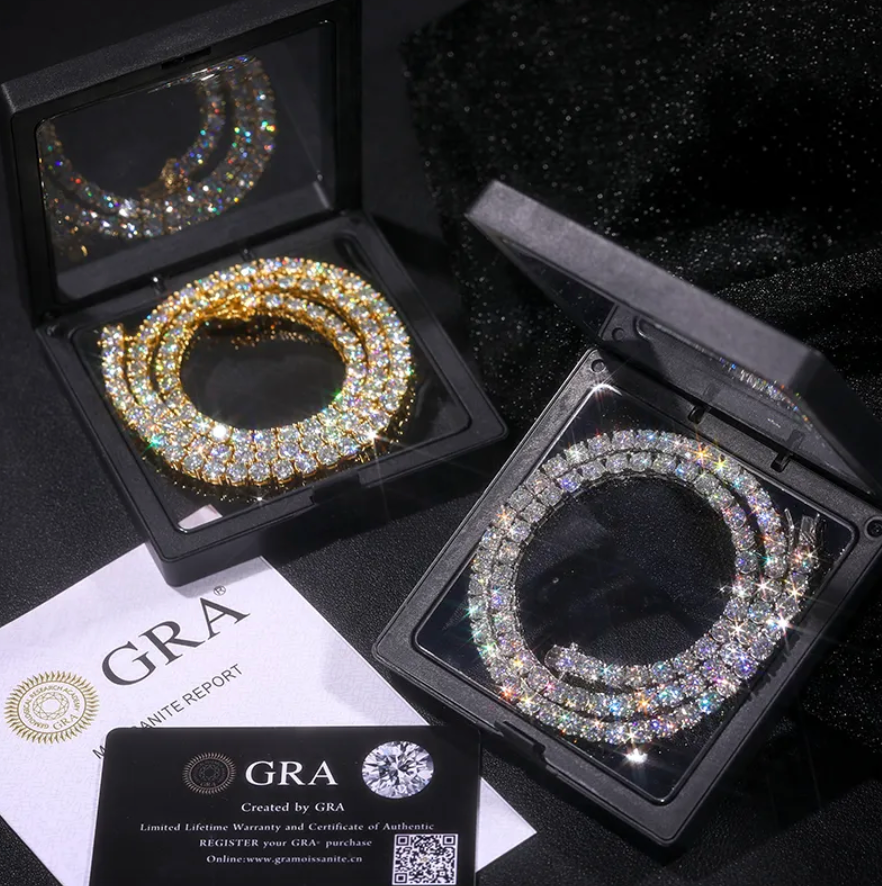 For our jewelry we use the most expensive simulated diamonds on the market today (CZ 6A+) and the best possible moissanite diamonds on the market, giving our jewelry the highest possible clarity of VVS1. Each diamond is handset by us using the prong setting technique. The prong setting technique ensures that the diamonds stay in their place and do not fall out as they would if they were simply glued to the piece.